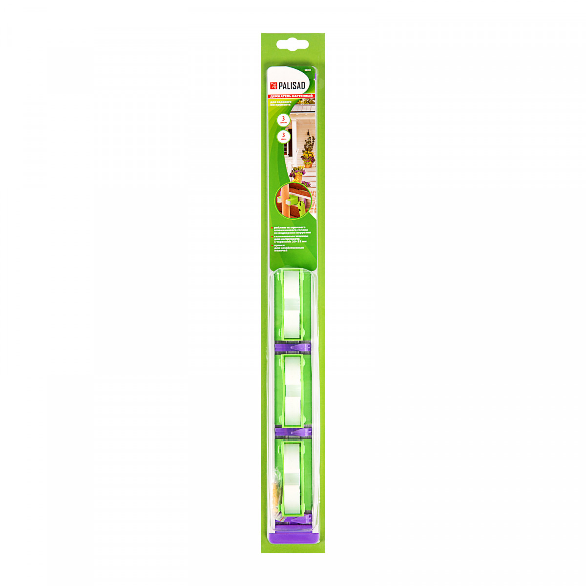 Алюминиевый настенный держатель для садово - огородного инструмента, 3 ячейки, 3 крюка, Palisad