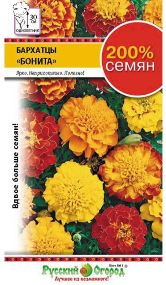 Бархатцы Бонита очень устойчивые практически к любым неблагоприятным погодным условиям. Всё дело в их крепких побегах и плотной шапке, формирующей куст. При этом бархатцы компактны, так как не разрастаются бесконтрольно в разные стороны. Цветение начинается уже спустя 2 месяца, поэтому посеяв семена на рассаду в апреле, уже в начале лета вы получите цветущие растения! Это очень удобно, так как, начиная с июня, бархатцы будут цвести, не переставая.