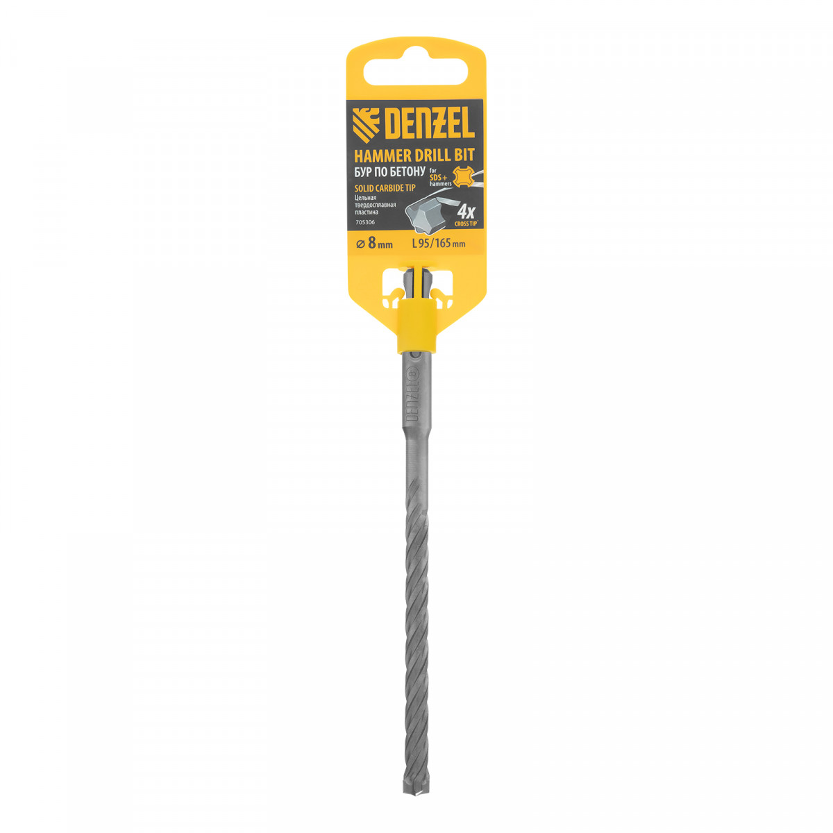 Бур по бетону, цельная крестовая пластина, 8x165 мм, SDS PLUS Denzel