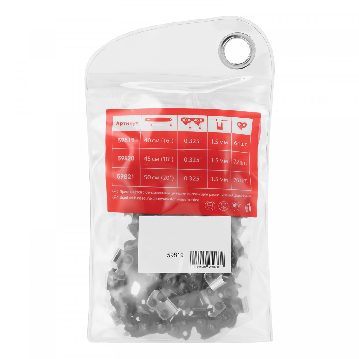 Цепь для бензопилы MTX 59819 с шириной паза 1,5 мм состоит из 64 звеньев с шагом 0,325″ и надевается на пильную шину длиной 40 см (16″). Оптимальна для частного применения в бытовых условиях, на небольшой стройке, в лесу, на рыбалке и в походе. Благодаря низкому уровню вибраций пилу с установленной цепью удобно удерживать в руках.