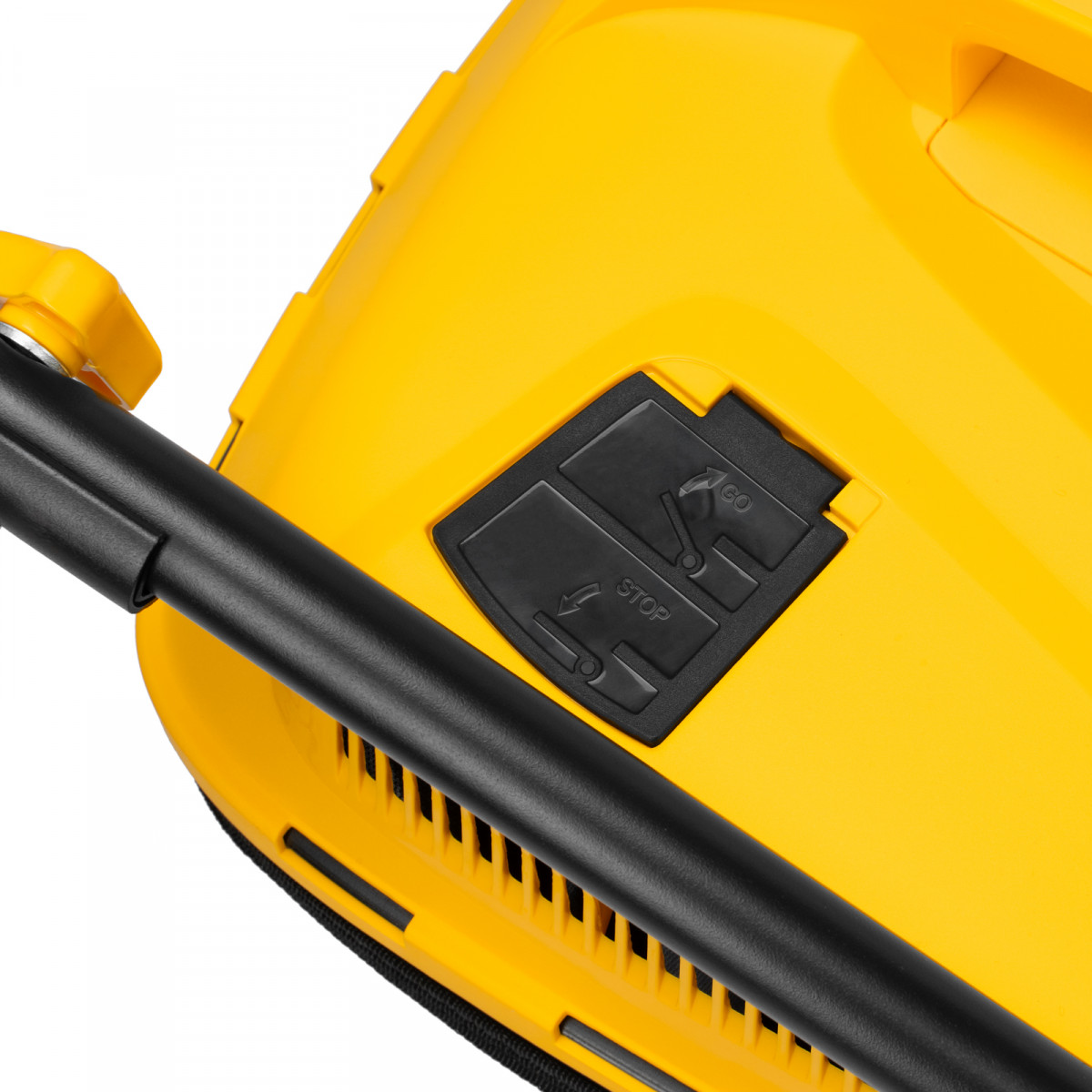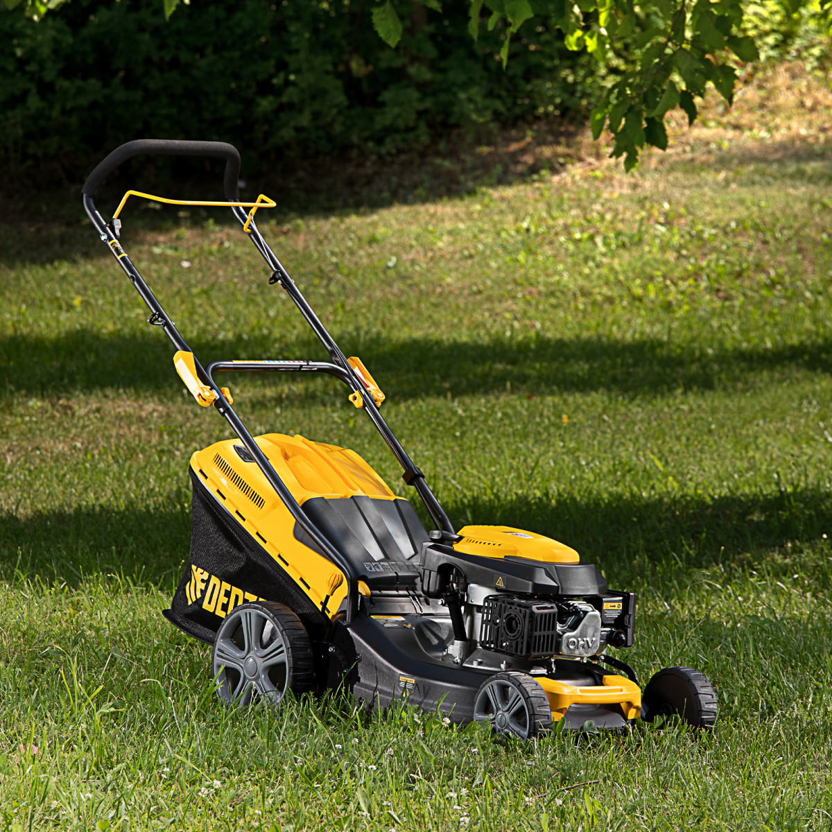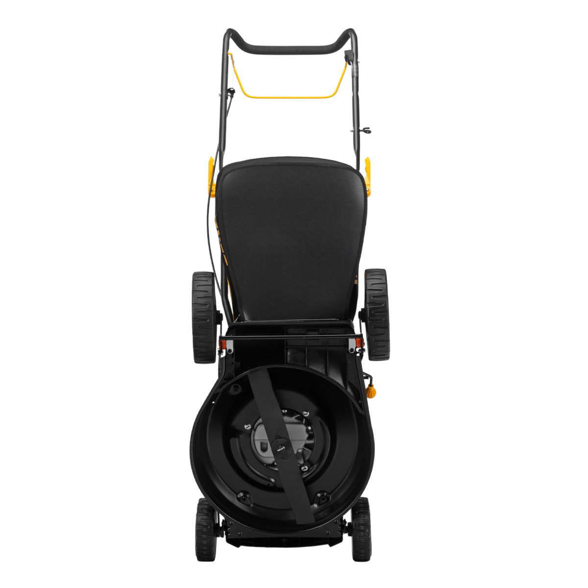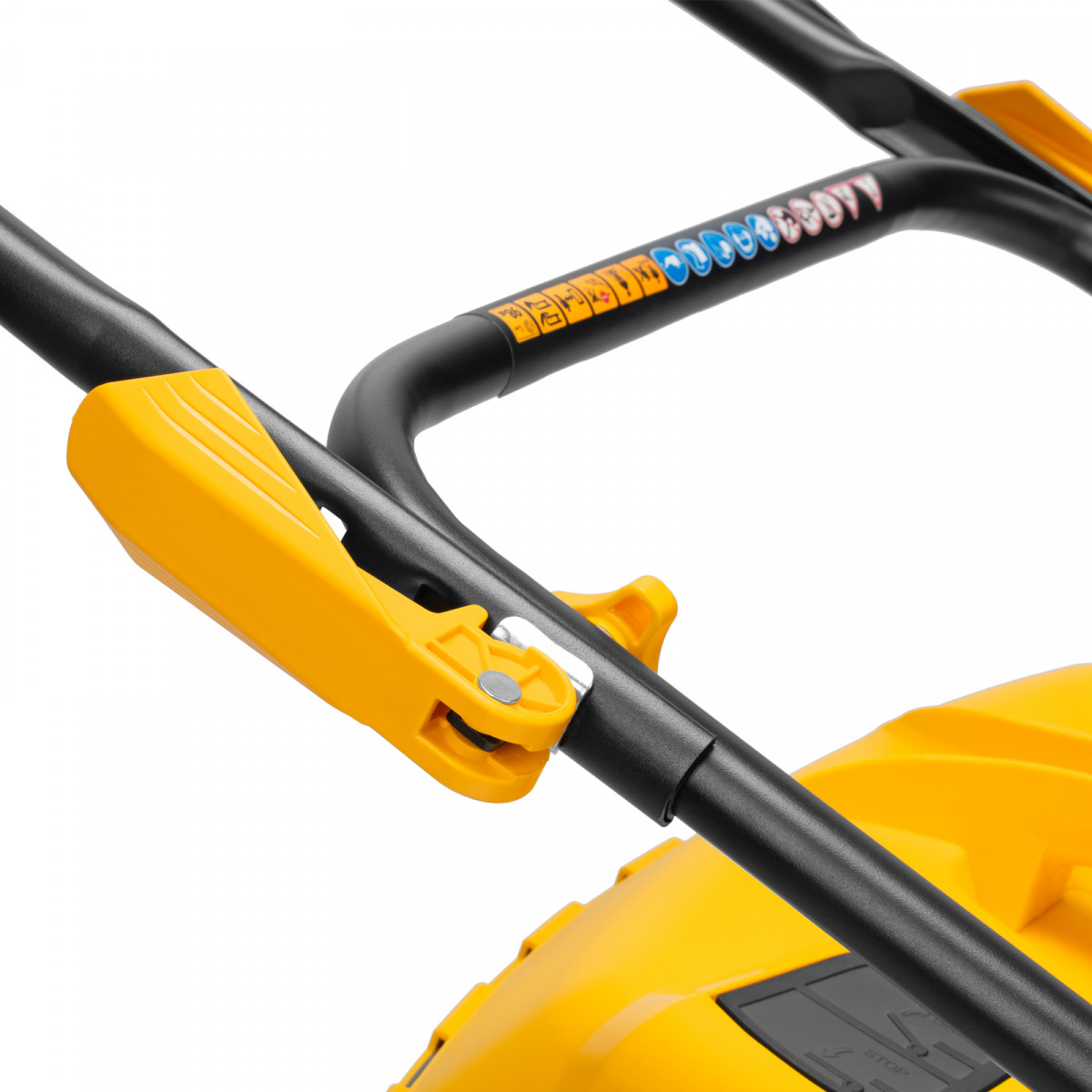 - Быстрая настройка — эксцентриковые фиксаторы ручки позволяют оперативно перевести газонокосилку в рабочее или транспортировочное положение, а 3 точки крепления обеспечивают регулировку вылета ручки под рост пользователя.