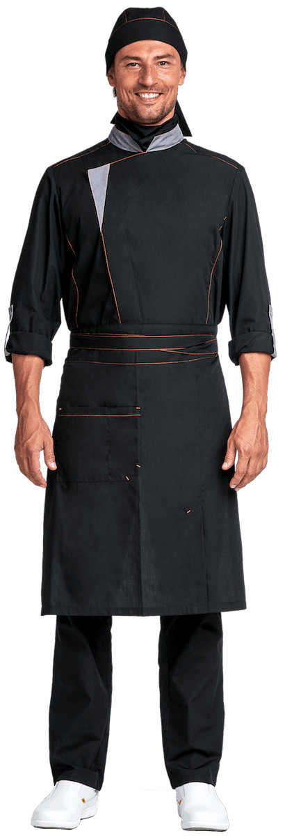 Костюм состоит из: куртки, брюк, фартука, банданы и шейного платка. Куртка: • смещённая бортовая застёжка • рельефы на полочках • спинка с кокеткой • воротник-стойка • рукава длинные с регулировкой по длине при помощи пат • с вентиляционными отверстиями на уровне подмышечных впадин и спинке Брюки: • прямые по всей длине • пояс частично с эластичной лентой на участке боковых швов, с шлёвками • боковые карманы на передних половинках Фартук: • накладной карман • разрез для свободы движения • завязки Бандана: • с завязками