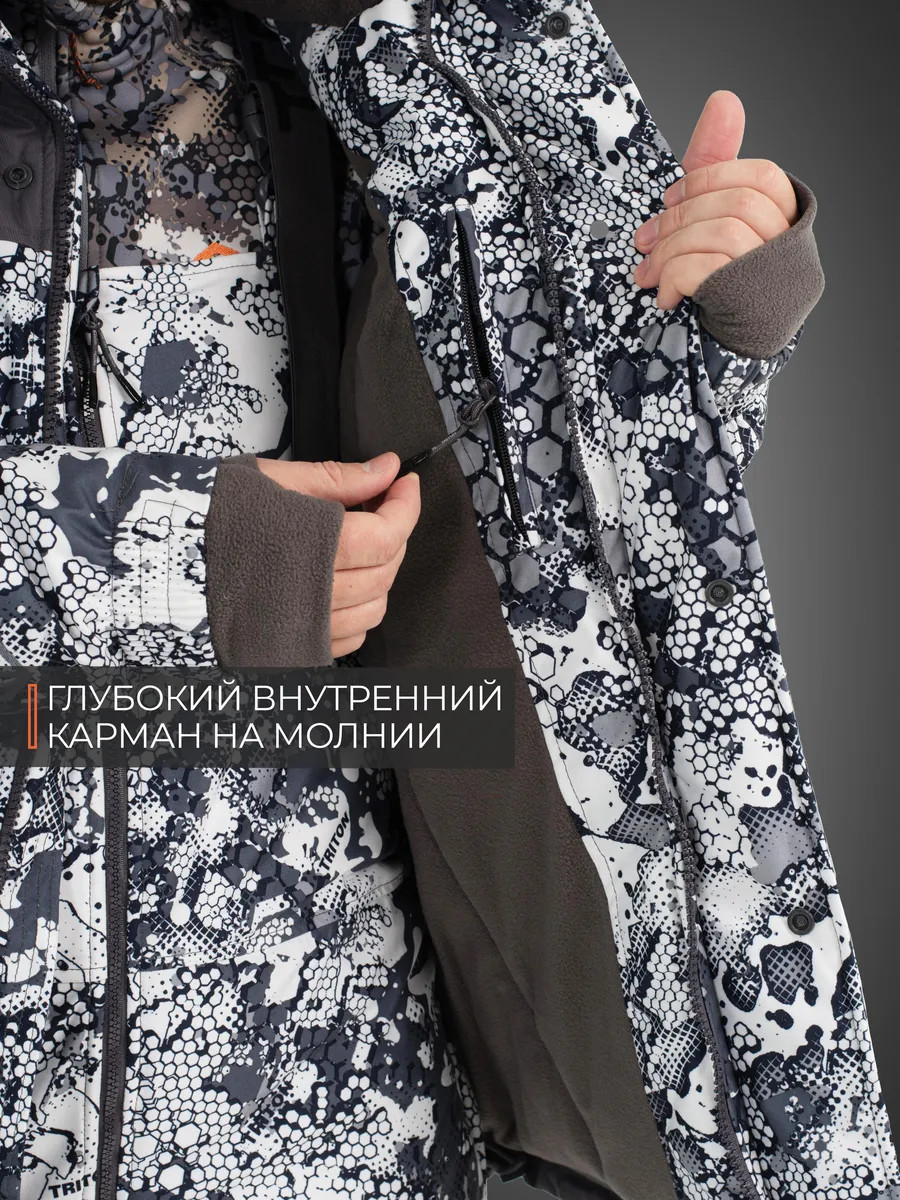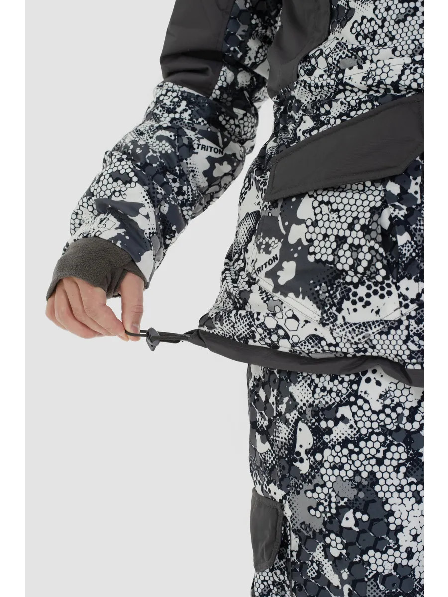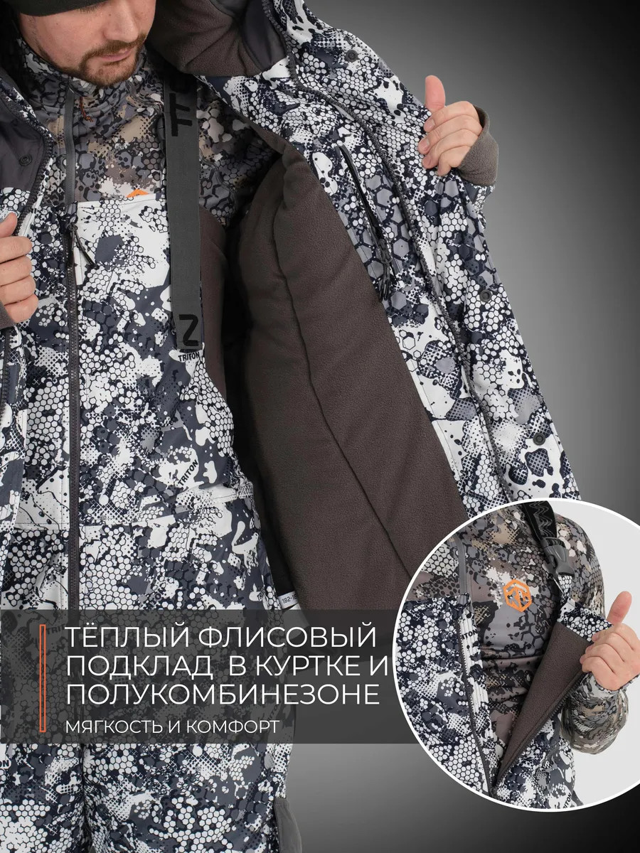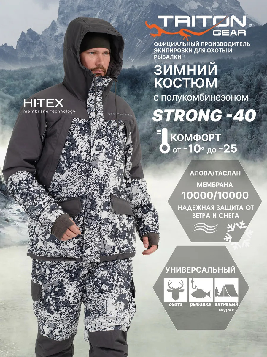Костюм "STRONG" -40 ПК (Алова, Белый)- это зимний костюм с полукомбинезоном, который отлично зарекомендовал себя среди охотников, рыболовов и любителей активного отдыха, подойдет под любое увлечение в зимний период. Рекомендуется использовать с термобельем Termo craft арт.279285980, или аналог. При низких температурах рекомендуется дополнительно использовать вторым слоем флисовый костюм Triton RICH арт.388130799. Таким образом, правильным будет использование с 1-ым слоем - термобельем, 2-ым слоем - флисовым комплектом и поверх надеваете костюм. При ношении мембранных костюмов не рекомендуем использовать вещи из натуральных тканей, таких как хлопок, или шерсть. Вещи из натуральных тканей не испаряют влагу тела, а накапливают ее в себе (намокают) и, как следствие вы сначала мокнете, а потом замерзаете. Изготовлен из материала Алова (100% полиэстер) – нешуршащей, мягкой на ощупь, долговечной, устойчивой к истиранию и многократным изгибам мембранной ткани нового поколения с высокими показателями паропроницаемости и водостойкости (10000/10000). Сочетает в себе теплоизолирующие, ветро- и влагоустойчивые показатели и прочность наружного слоя. Внешняя поверхность блокирует ветер, а внутренний слой ткани защищает от избыточной влаги. Отделка ТАСЛАН (100% нейлон) - современная мембранная ткань с высокими прочностными характеристиками. Утеплитель TRITERM – создан из ультратонких волокон - на 30% тоньше и легче обычного синтепона. Подклад Флис - мягкий ворсистый материал, позволяет телу дышать, отводит влагу от тела, быстро сохнет и обладает теплоизолирующими свойствами. Куртка средней длины Брюки полукомбинезон с эластичными вставками Ветрозащитная планка центральной молнии. Двухзамковые молнии на куртке и брюках 6 внешних карманов и внутренний карман на куртке 4 кармана на брюках. Анатомический крой колена. Анатомический крой рукава. Регулируемый капюшон. Регулировка ширины по низу куртки. Эластичные манжеты на рукавах с прорезью под большой палец. Противосугробные манжеты.