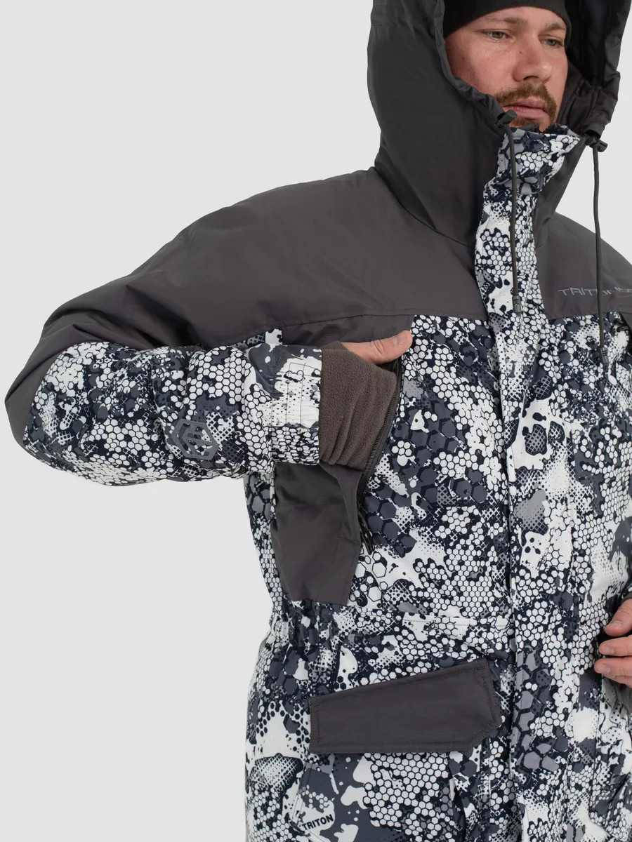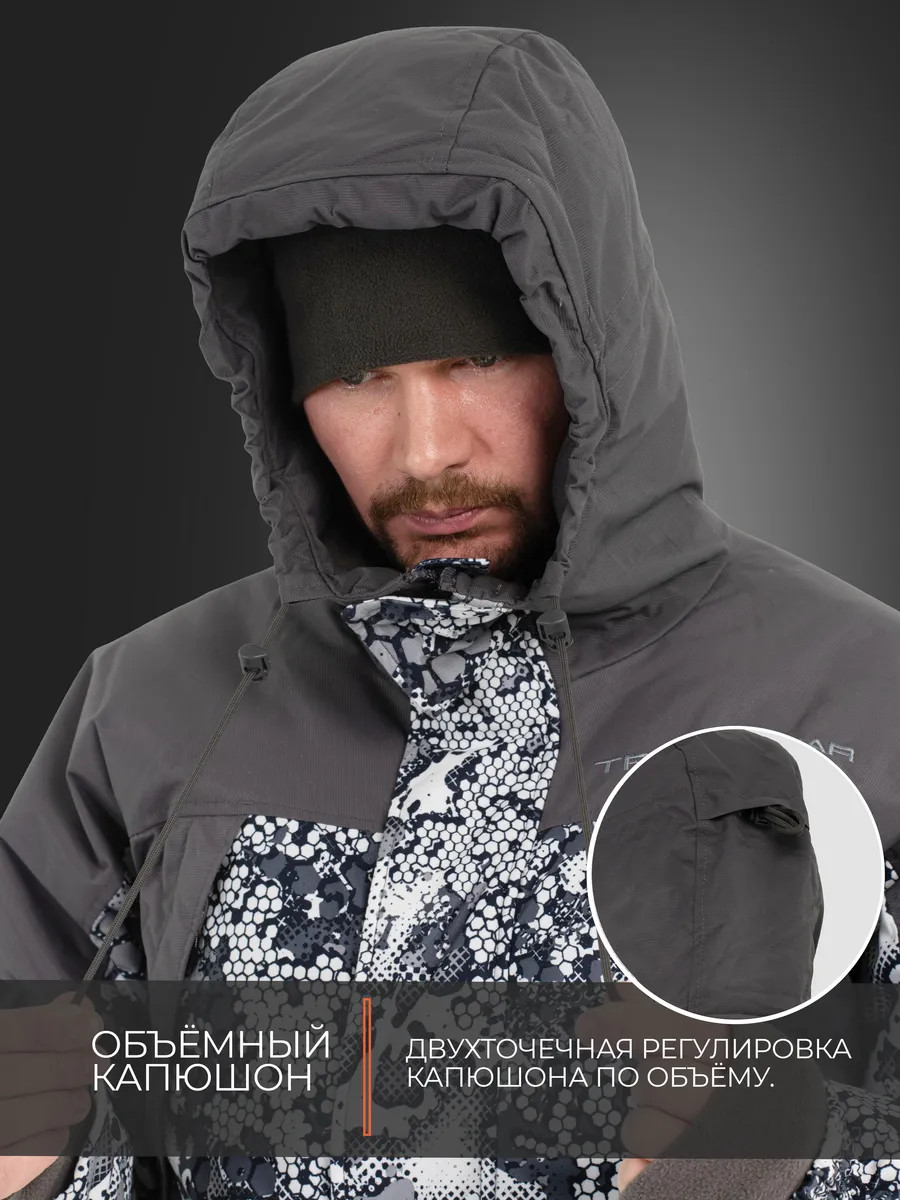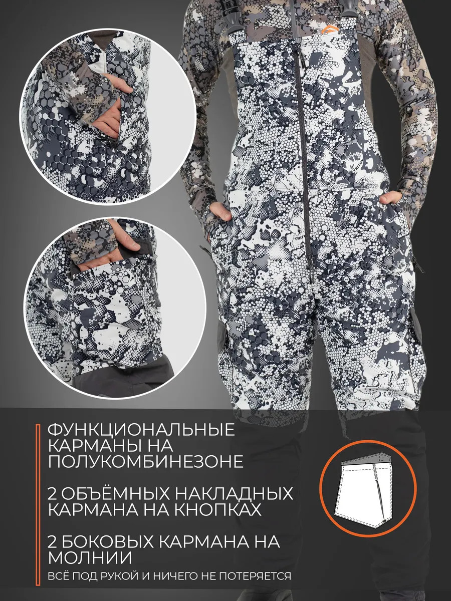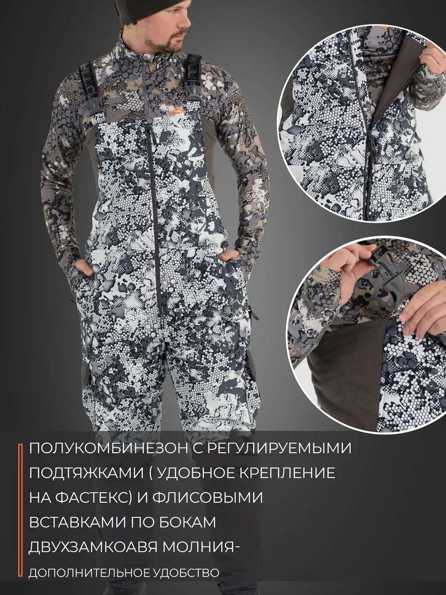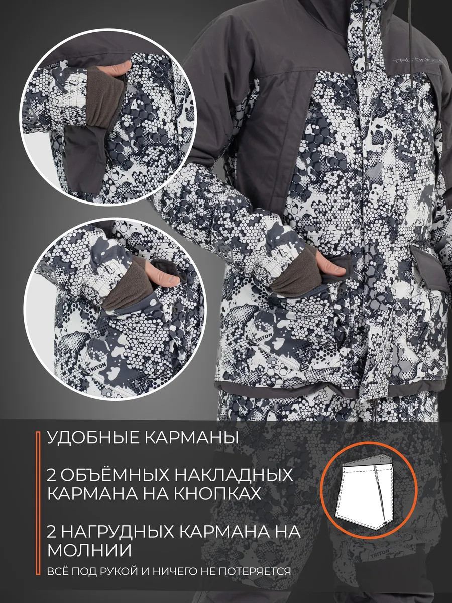 Костюм "STRONG" -40 ПК (Алова, Белый)- это зимний костюм с полукомбинезоном, который отлично зарекомендовал себя среди охотников, рыболовов и любителей активного отдыха, подойдет под любое увлечение в зимний период. Рекомендуется использовать с термобельем Termo craft арт.279285980, или аналог. При низких температурах рекомендуется дополнительно использовать вторым слоем флисовый костюм Triton RICH арт.388130799. Таким образом, правильным будет использование с 1-ым слоем - термобельем, 2-ым слоем - флисовым комплектом и поверх надеваете костюм. При ношении мембранных костюмов не рекомендуем использовать вещи из натуральных тканей, таких как хлопок, или шерсть. Вещи из натуральных тканей не испаряют влагу тела, а накапливают ее в себе (намокают) и, как следствие вы сначала мокнете, а потом замерзаете. Изготовлен из материала Алова (100% полиэстер) – нешуршащей, мягкой на ощупь, долговечной, устойчивой к истиранию и многократным изгибам мембранной ткани нового поколения с высокими показателями паропроницаемости и водостойкости (10000/10000). Сочетает в себе теплоизолирующие, ветро- и влагоустойчивые показатели и прочность наружного слоя. Внешняя поверхность блокирует ветер, а внутренний слой ткани защищает от избыточной влаги. Отделка ТАСЛАН (100% нейлон) - современная мембранная ткань с высокими прочностными характеристиками. Утеплитель TRITERM – создан из ультратонких волокон - на 30% тоньше и легче обычного синтепона. Подклад Флис - мягкий ворсистый материал, позволяет телу дышать, отводит влагу от тела, быстро сохнет и обладает теплоизолирующими свойствами. Куртка средней длины Брюки полукомбинезон с эластичными вставками Ветрозащитная планка центральной молнии. Двухзамковые молнии на куртке и брюках 6 внешних карманов и внутренний карман на куртке 4 кармана на брюках. Анатомический крой колена. Анатомический крой рукава. Регулируемый капюшон. Регулировка ширины по низу куртки. Эластичные манжеты на рукавах с прорезью под большой палец. Противосугробные манжеты.
