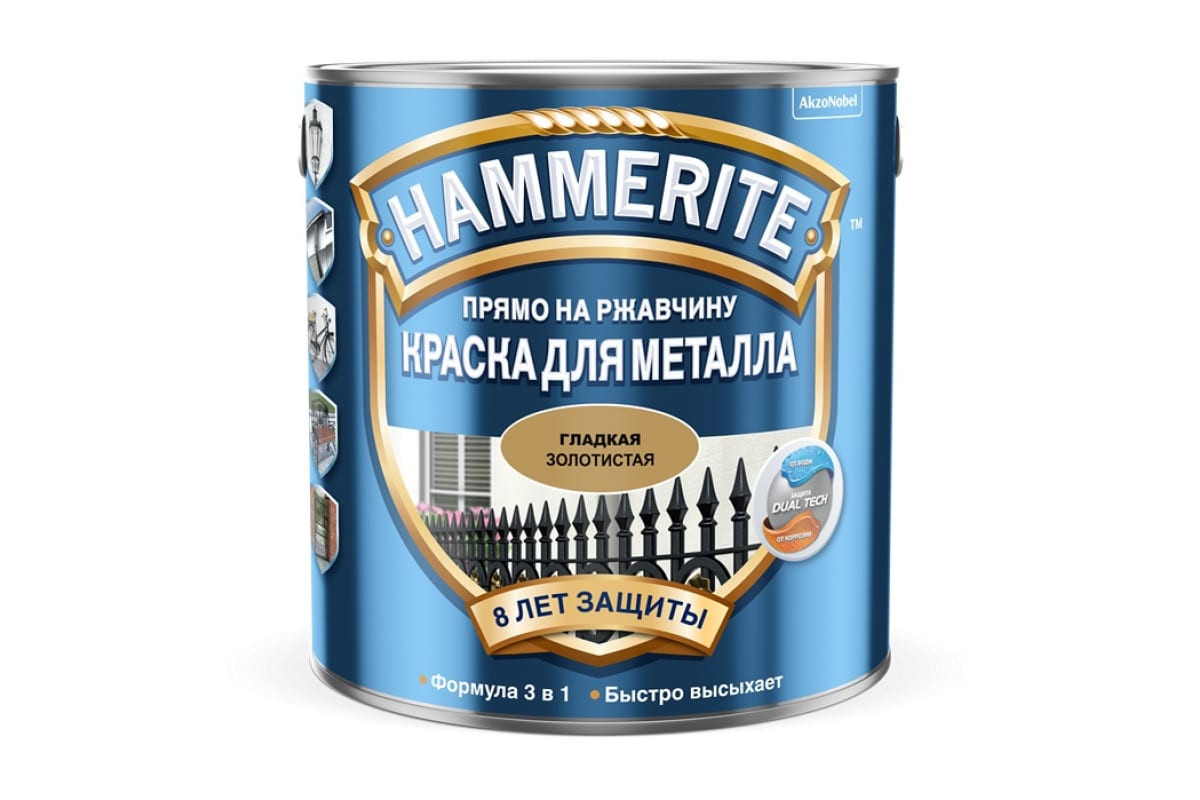 Краска для металла HAMMERITE прямо на ржавчину, предназначена для обработки металлических, деревянных, стеклянных, пластиковых, кафельных поверхностей (решеток, заборов, ворот, садовой мебели, инструмента). Возможно нанесение состава на неокрашенные (ржавые) поверхности. Применяется для внутренних и наружных работ.Краска создает безупречное гладкое покрытие с глянцевым блеском. Наносится с помощью кисти, распылителя или валика.Продукт содержит силиконовый компонент, придающий покрытию высокие водоотталкивающие свойства и гарантирует антикоррозийную стойкость до 8 лет.