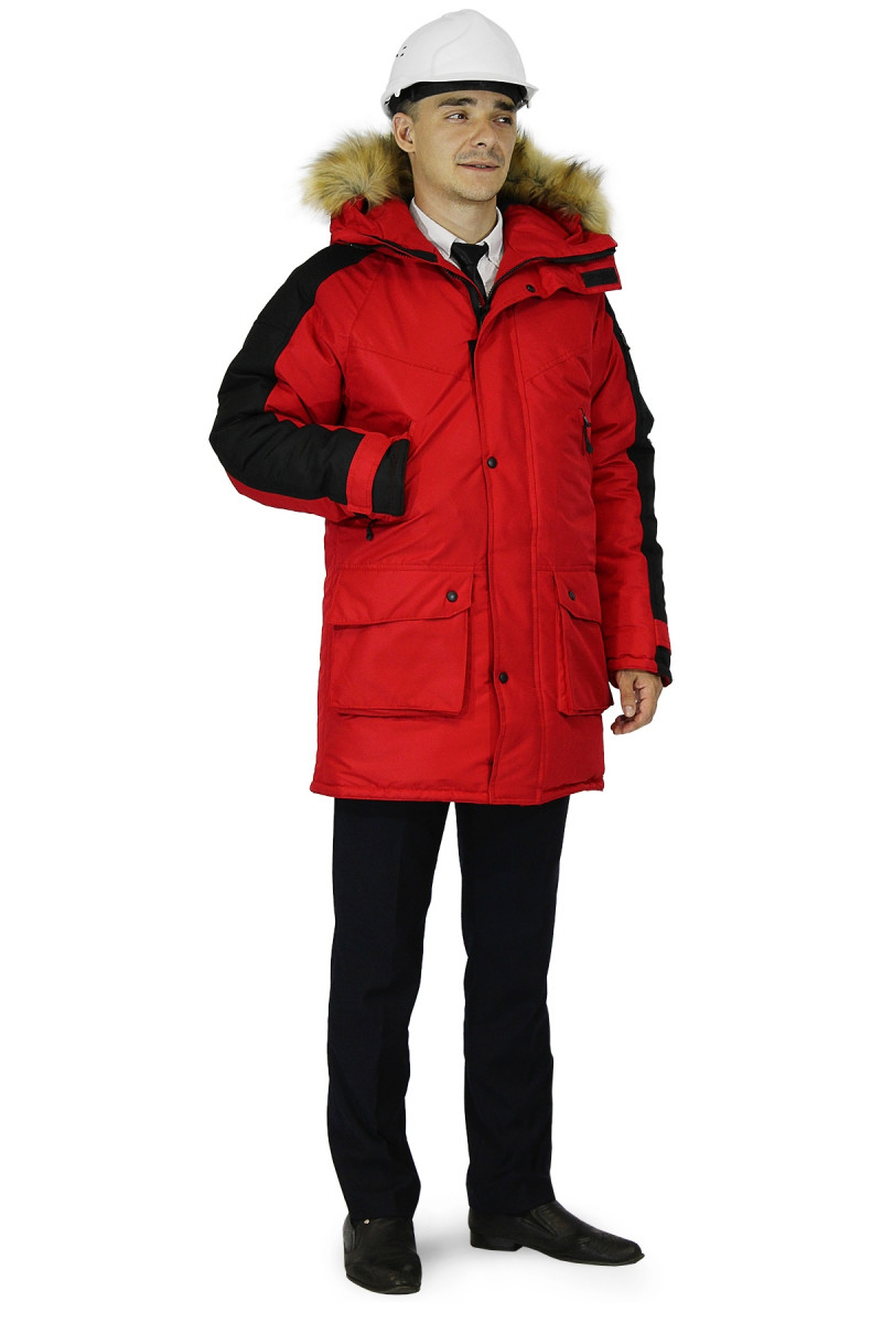 Застежка на двухзамковую молнию и ветрозащитный клапан. Капюшон со съемной опушкой из искусственного меха (енот) стягивается шнуром. Рукава с полушерстяными напульсниками, регулируются по ширине патой. Утепленные флисом нагрудные и боковые объемные карманы, накладной карман на левом рукаве, внутренние карманы, под ветрозащитным клапаном – потайной карман с молнией (для планшета и документов формата А4). Внутренняя ветрозащитная юбка.