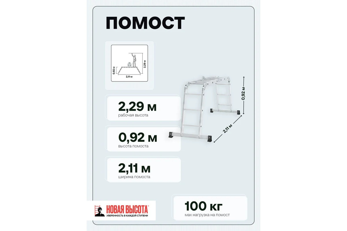 Четырехсекционная лестница-трансформер Новая Высота 4х3 ступени отличается универсальностью, компактностью при хранении, устойчивостью. Легко преобразуется в помост-платформу, стремянку, приставную лестницу, лестницу с выносом. Оснащена стойками с дополнительным усилением в наиболее нагруженных местах для повышения жесткости. Благодаря многократной развальцовке в соединении ступеней со стойками изделие имеет долгий срок службы.