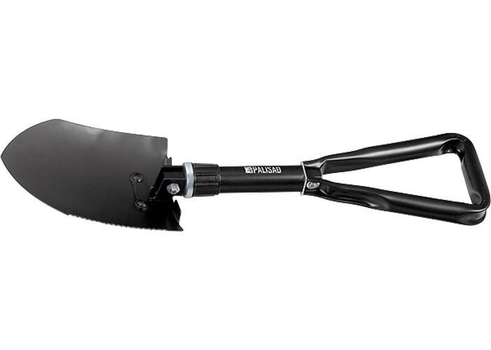 Универсальная штыковая складная лопата с заостренным металлическим ковшом 150 х 200 мм и складным двухсекционным металлическим черенком 380 мм. На черенке имеется резьбовой зажим, надежно фиксирующий инструмент в необходимом для работы положении. Поставляется в комплекте с нейлоновым чехлом для удобства транспортировки и хранения. Предназначена для многоцелевого использования в походных условиях. Зубцы на одной из сторон ковша позволяют использовать инструмент в качестве пилы. Если повернуть ковш на 90° и закрепить его зажимом, лопату можно использовать в качестве мотыжки. Изготовлена из инструментальной стали У8 и закалена. Окрашена порошковой эмалью для защиты от коррозии.
