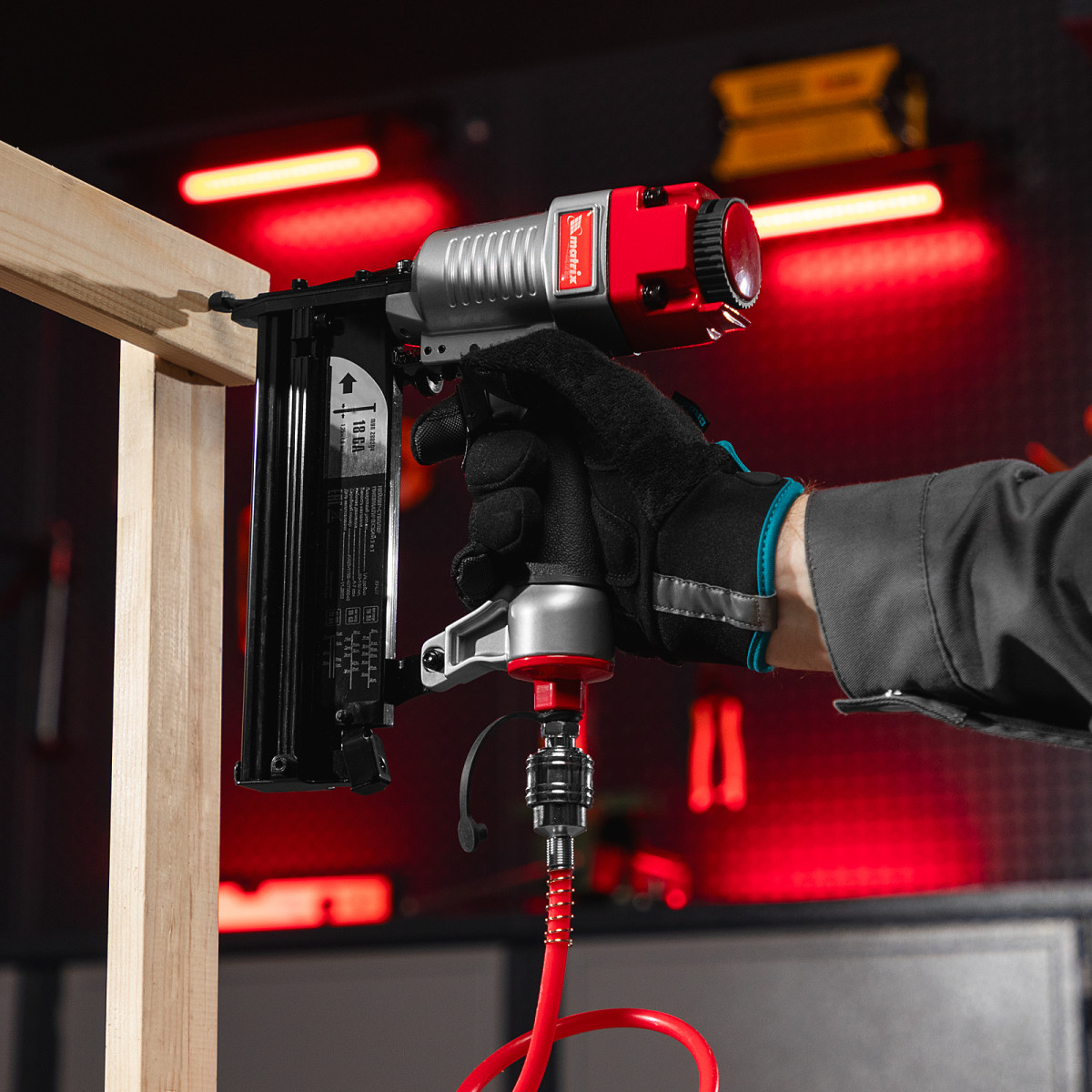 Пневматический нейлер-степлер 3 в 1 Matrix 57427 способен забивать на регулируемую глубину скобы 18 GA и гвозди 18GA и 16GA. Используется для фиксации паркетной доски, фанеры, ДВП, шифера, гипсокартона, ткани и бумаги. Пригодится во время ремонта, а также для сборки мебели и отделочных работ. Расход воздуха составляет 107 л/мин, поэтому нейлер-степлер можно подключать к любому типу компрессоров.