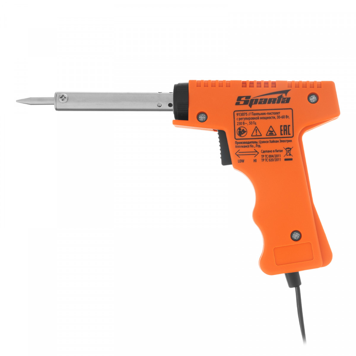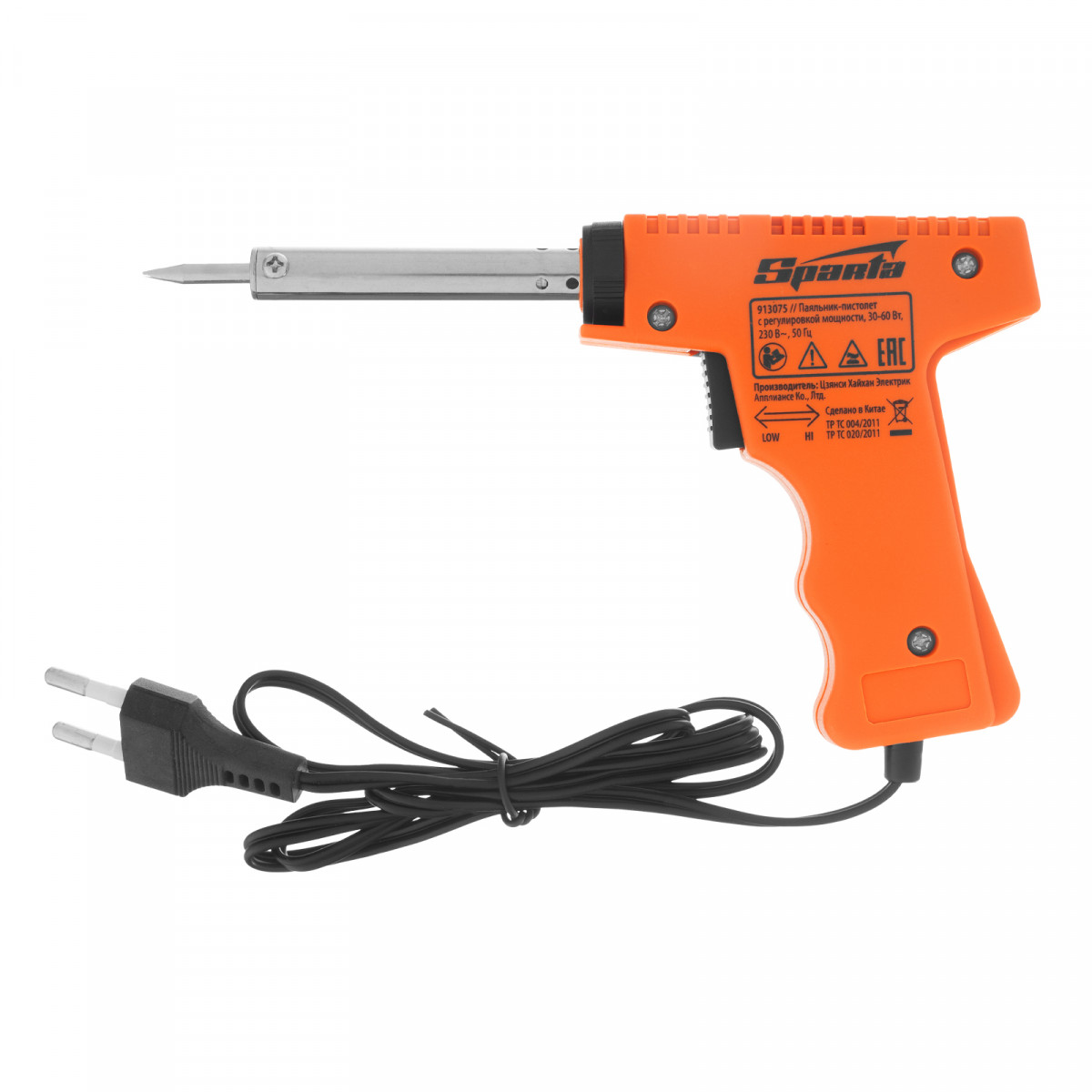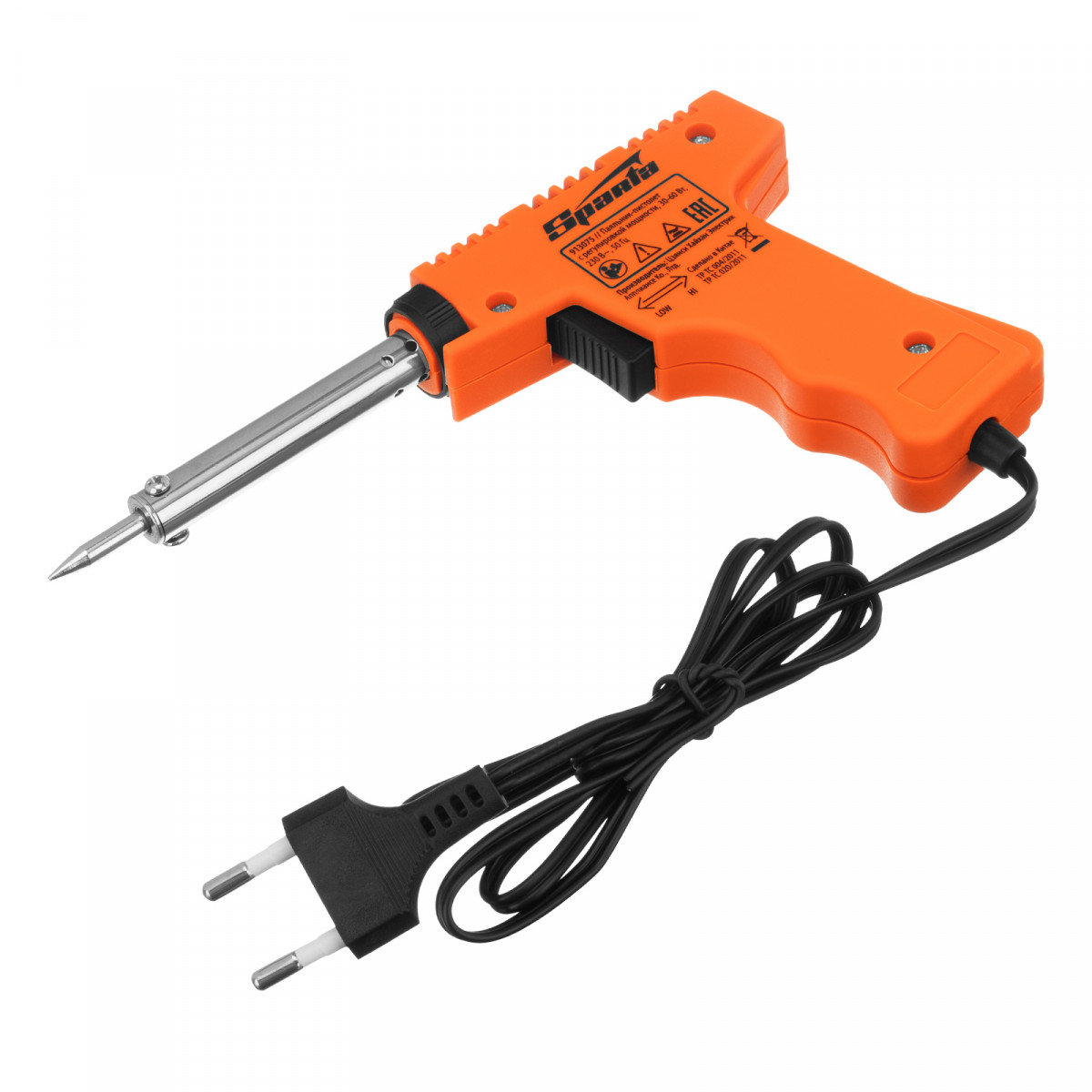 Паяльник-пистолет Sparta 913075 с регулировкой мощности 30-60 Вт питается от сети 220 В и предназначен для пайки микрочипов, транзисторов, электросхем, кабелей. Благодаря керамическому нагревательному элементу подходит для длительной непрерывной работы. Съемное жало может быть заменено в случае необходимости. Температура нагрева регулируется нажатием кнопки на рукоятке. Простой в применении прибор пригодится электромонтерам, радиолюбителям, автоэлектрикам, а также будет полезен в быту.