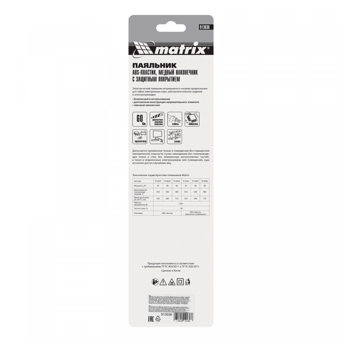Паяльник, пластик ABS с пониженной теплопроводностью, медный наконечник с долговечным покрытием, 220 В, 60 W Matrix