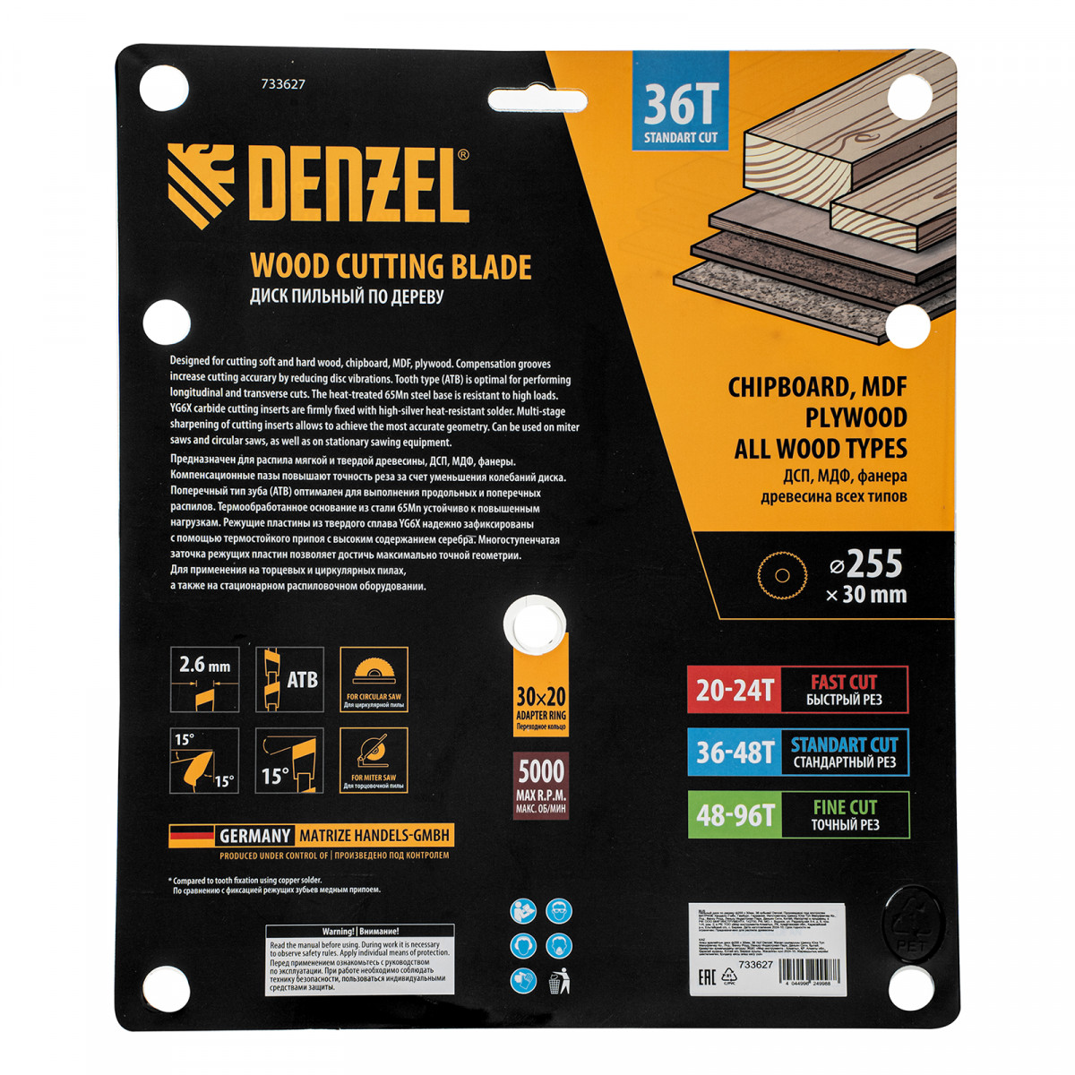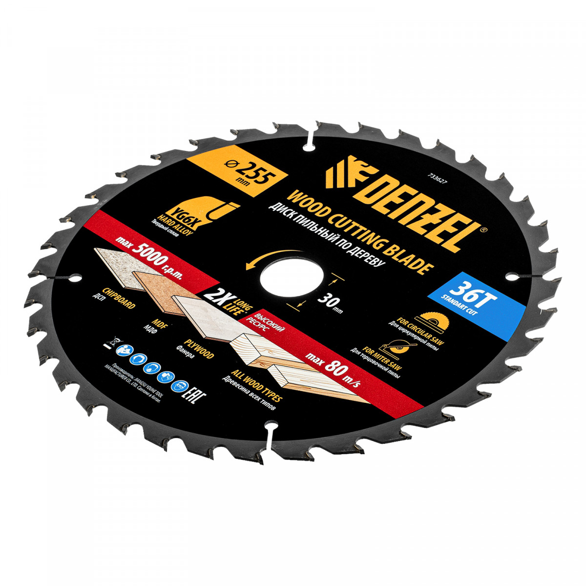 Пильный диск Denzel 733627 диаметром 255 x 30 мм, с 36 зубьями, предназначен для продольного и поперечного распила твердой и мягкой древесины, фанеры, МДФ, ДСП. 36 зубьев типа ATB с режущими пластинами оптимальной геометрии обеспечивают качественный рез. Тип реза — стандартный. Режущие пластины из твердого сплава YG6X сохраняют рабочие свойства при интенсивном использовании. Диск устанавливается на циркулярную, торцовочную пилу или на распиловочный станок. В комплект поставки входит переходное кольцо с 30 на 20 мм, что позволяет изменить посадочный размер и расширяет возможности использования диска.
