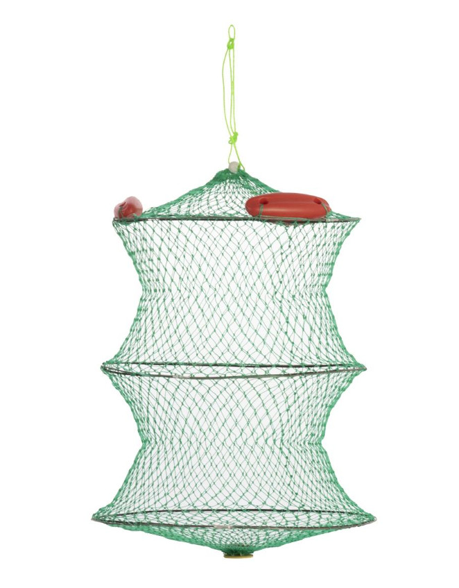 Трехкольцевой капроновый плавающий садок. Имеет три блока-поплавка, которые удерживают садок на поверхности воды. Три металлических обода и огрузка в нижней части, стабильно держат форму садка в раскрытом виде.Характеристики:
