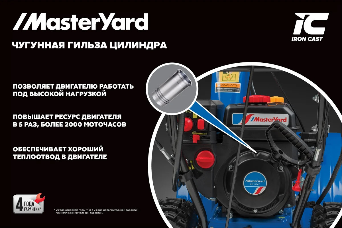 Четырехтактный бензиновый двигатель MasterYard 182cc для зимней работы. Запатентованная технология LCPower позволяет получить повышенную производительность и сниженный уровень выбросов, благодаря чему двигатель соответствует стандартам EPA Phase III и CARB. Новая камера сгорания, T-образная форма поршня и колец снижают уровень выбросов несгоревших углеводородов и предотвращают потерю мощности за счет трения. Новая система зажигания с оптимальной регулировкой опережения позволяет топливной смеси сгорать полнее, обеспечивая более высокий уровень мощности