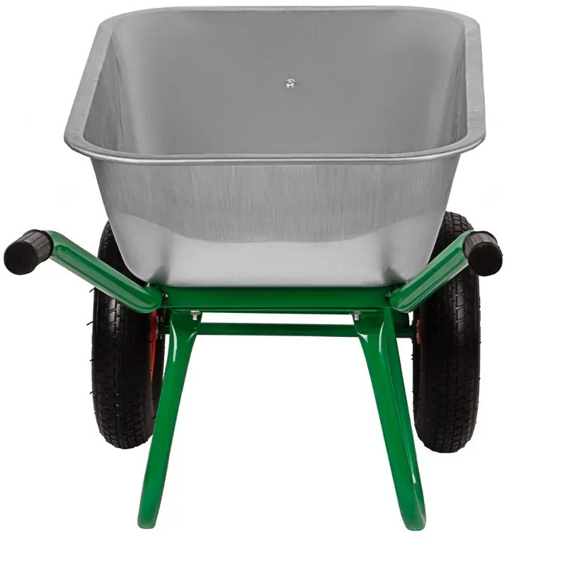 Двухколесная строительная тачка с пневмоколесом используется для перевозки садовых и строительных материалов. Два пневматических колеса способствует хорошей проходимости и отличаются бесшумностью при движении. Корыто из оцинкованной стали с полимерным покрытием отличается устойчивостью к воздействию коррозии для долгого срока службы. Резиновые накладки обеспечивают надежное удержание тачки. Объем кузова 110л, грузоп-сть 250кг, колесо 3.25-8, толщина метала кузова 0,7 мм, трубы 30*25 мм.