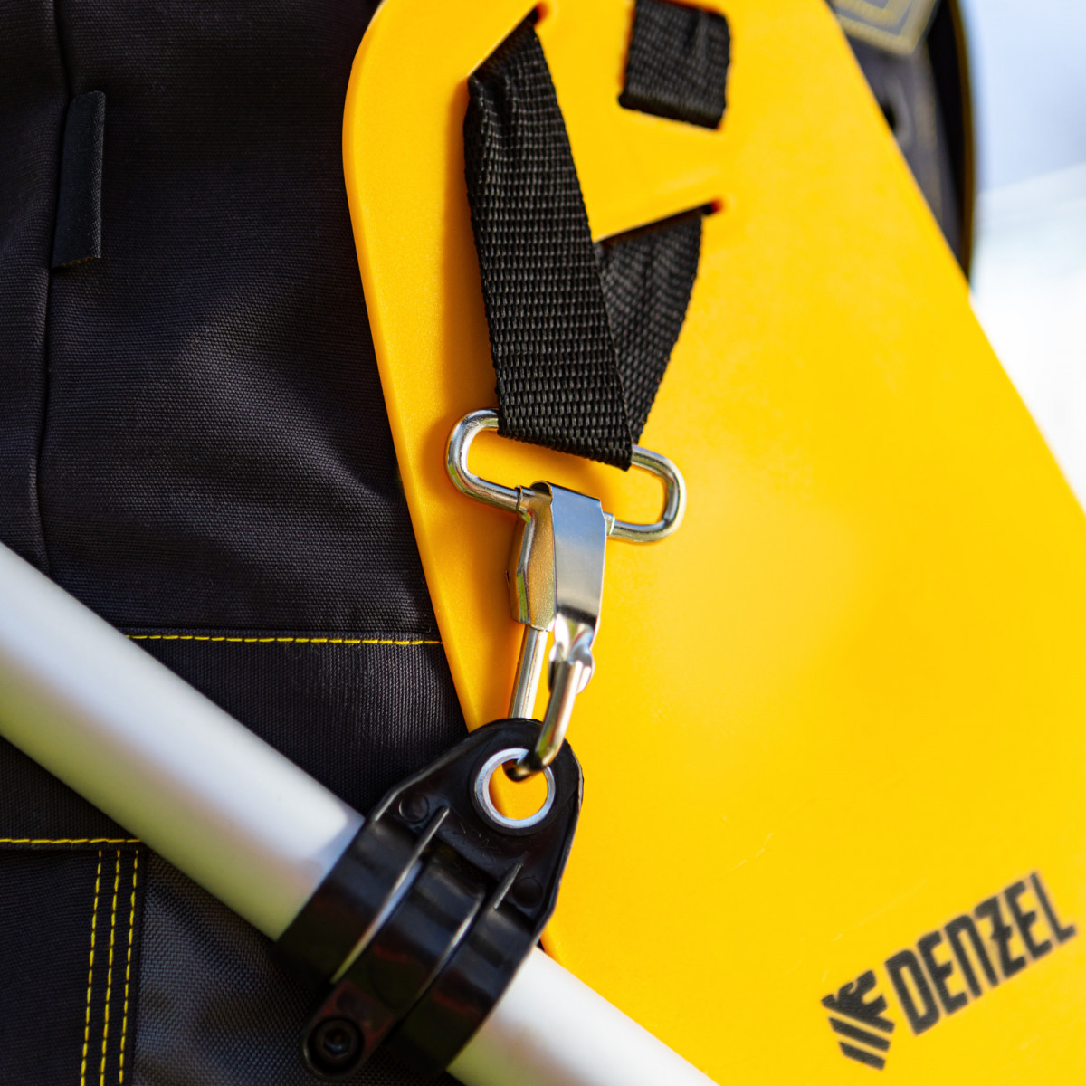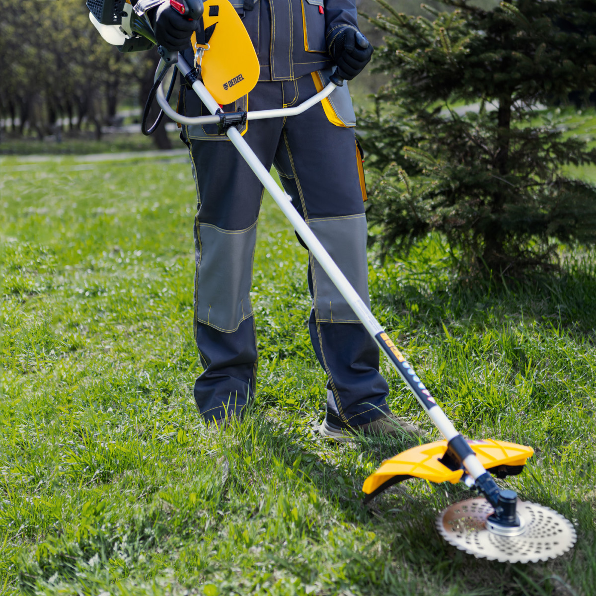 • Дополнительные возможности — можно приобрести и установить на триммер диск Denzel 96323 для быстрого удаления растительности с жесткими стеблями, 96328 для скашивания молодых побегов кустарника диаметром до 3 мм.
