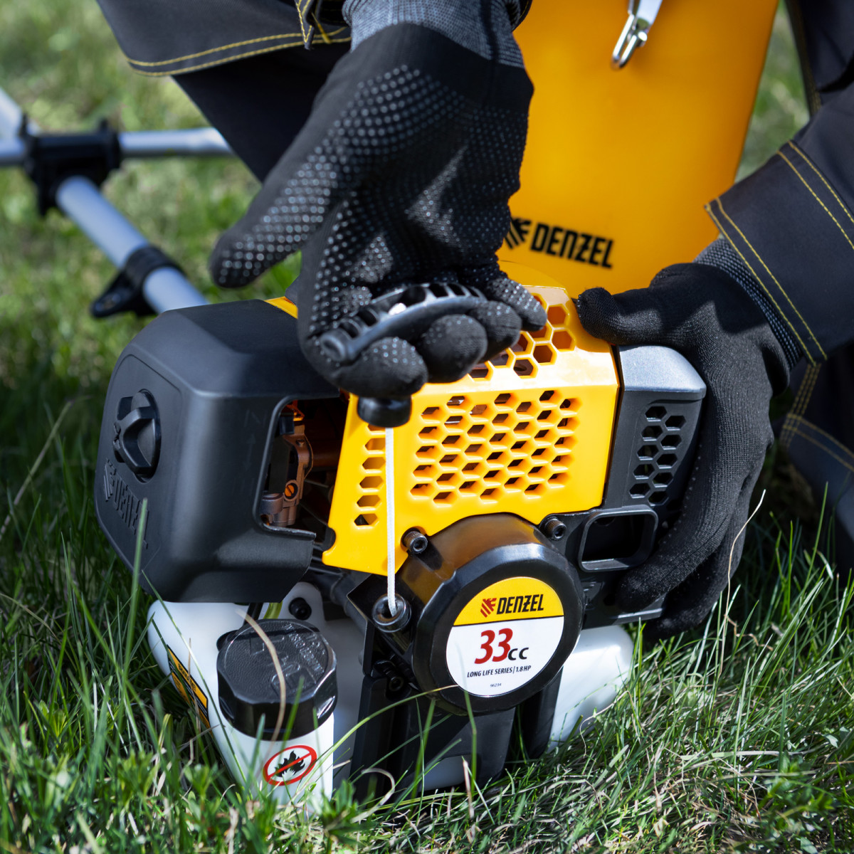 Бензиновый триммер Denzel DGT-330 93234 с двигателем объемом 33 см3 и мощностью 1,8 л. с., с неразъемной штангой, состоит из 2 частей. Комплектуется усиленной катушкой из полиамида, трехлопастным ножом и пильным диском. Предназначен для подравнивания газона, скашивания травы различных типов, в том числе с жесткими стеблями (полыни, крапивы, лебеды), а также срезания борщевика, кустарника и молодых побегов деревьев с диаметром стволов до 10 мм. Удобен для работы в местах, недоступных для колесной косилки.