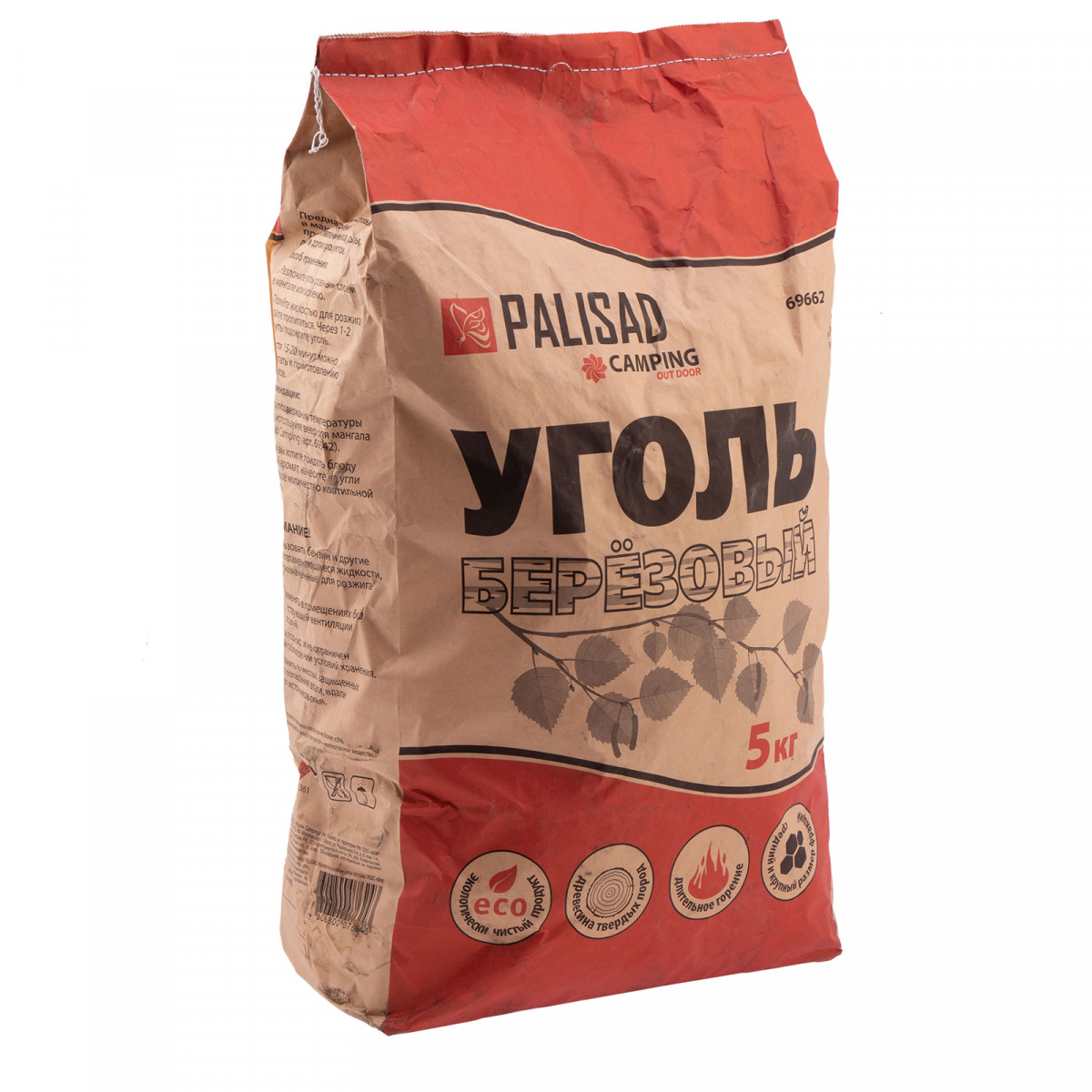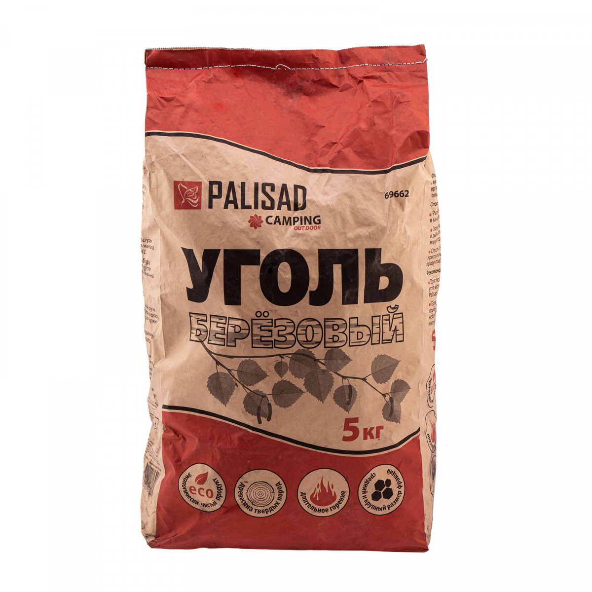 Березовый уголь Palisad Camping 69662, объем упаковки 5 кг, используется в качестве топлива для приготовления пищи на открытом воздухе: с помощью мангала, гриля или барбекю. Пакета хватит для небольшой компании на даче или пикнике.